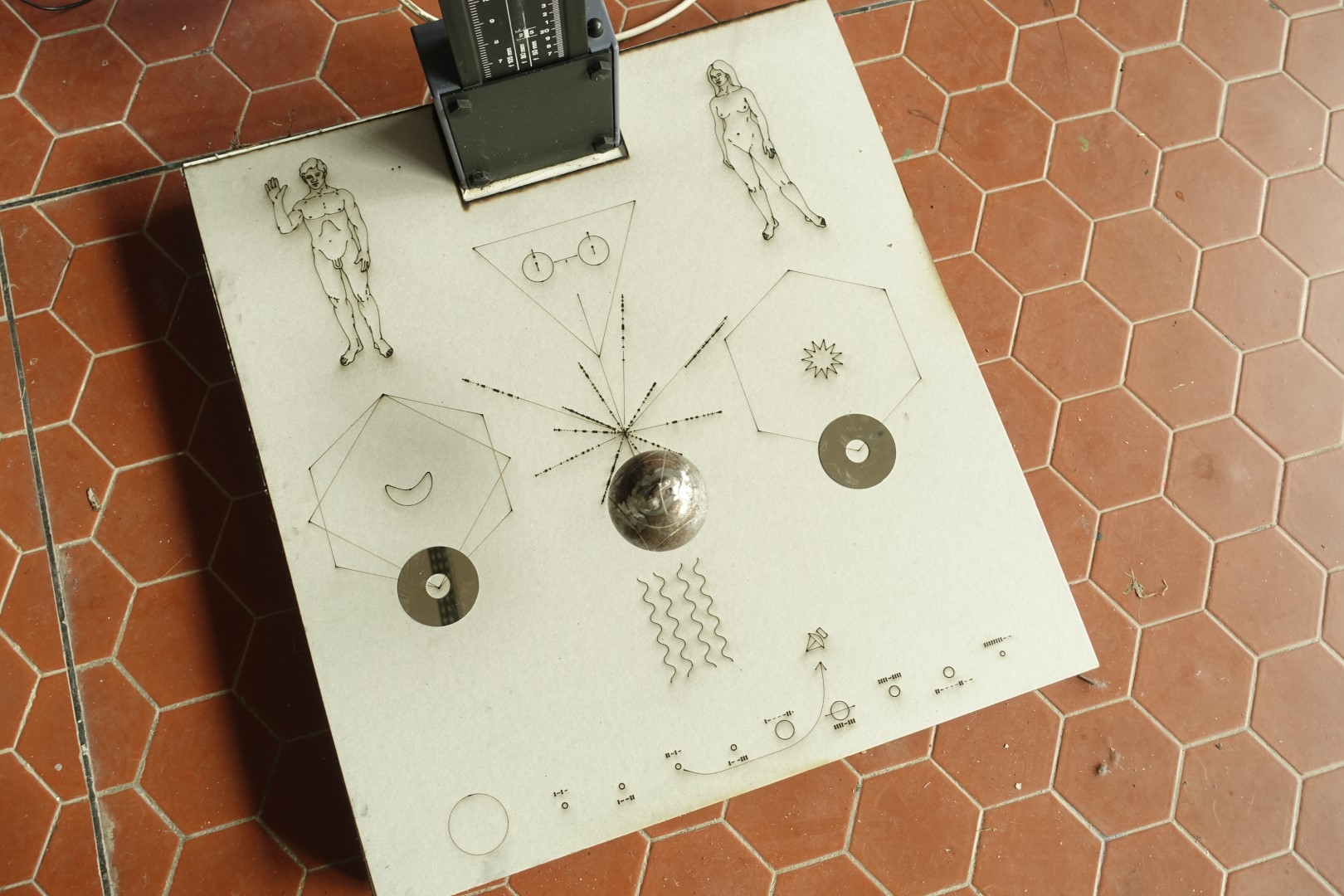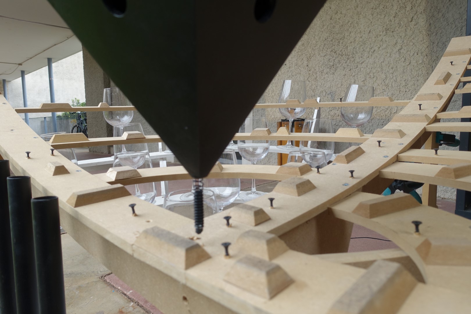Workshop autour de la réalisation d'installations génératives, Elles sont constituées d’un pendule qui oscille au-dessus d’une partition spatiale. Performatives, ces instruments sont activées par un lanceur, l’interprète, qui d’un simple geste définira inconsciemment le cours des choses. Effectivement, une fois jeté, le pendule heurte, tout au long de sa course, la sculpture qui produit ainsi des rythmiques de sons acoustiques propres aux matériaux employés.