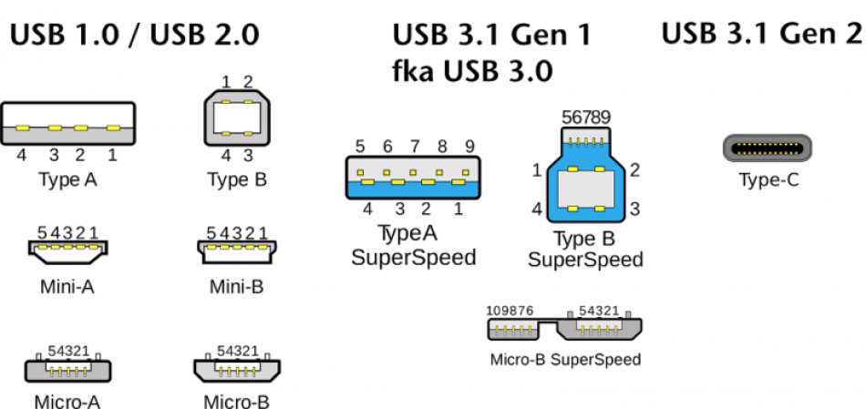 Afficher le texte sourceAnciennes révisionsLiens de retourHaut de page Share via Share via... Twitter Facebook Pinterest Telegram WhatsAppDerniers changementsSend via e-MailImprimerPermalien × Ceci est une ancienne révision du document ! Normes USB (Universal Serial Bus) Les différentes normes déterminent des débits, théoriques, et des connectiques différent.e.s. 1996- USB 1.1 : 12 Mo/s 2002- USB 2.0 (High-Speed): 480 Mo/s 2008- USB 3.1 Gen 1: 5 Gb/s 2013- USB 3.1 Gen 2 : 10 Gb/s bases/video/formation/connectic/informatique.1612442879.txt.gz Dernière modification: 2021/02/04 13:47de enseignant